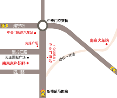 南京站:步行至南京车站,乘坐56路,在中央门南站下车。乘坐地铁1号线(奥体中心方向)(或地铁1号线南延线(中国药科大学方向)),在新模范马路站下车(2号出口)。